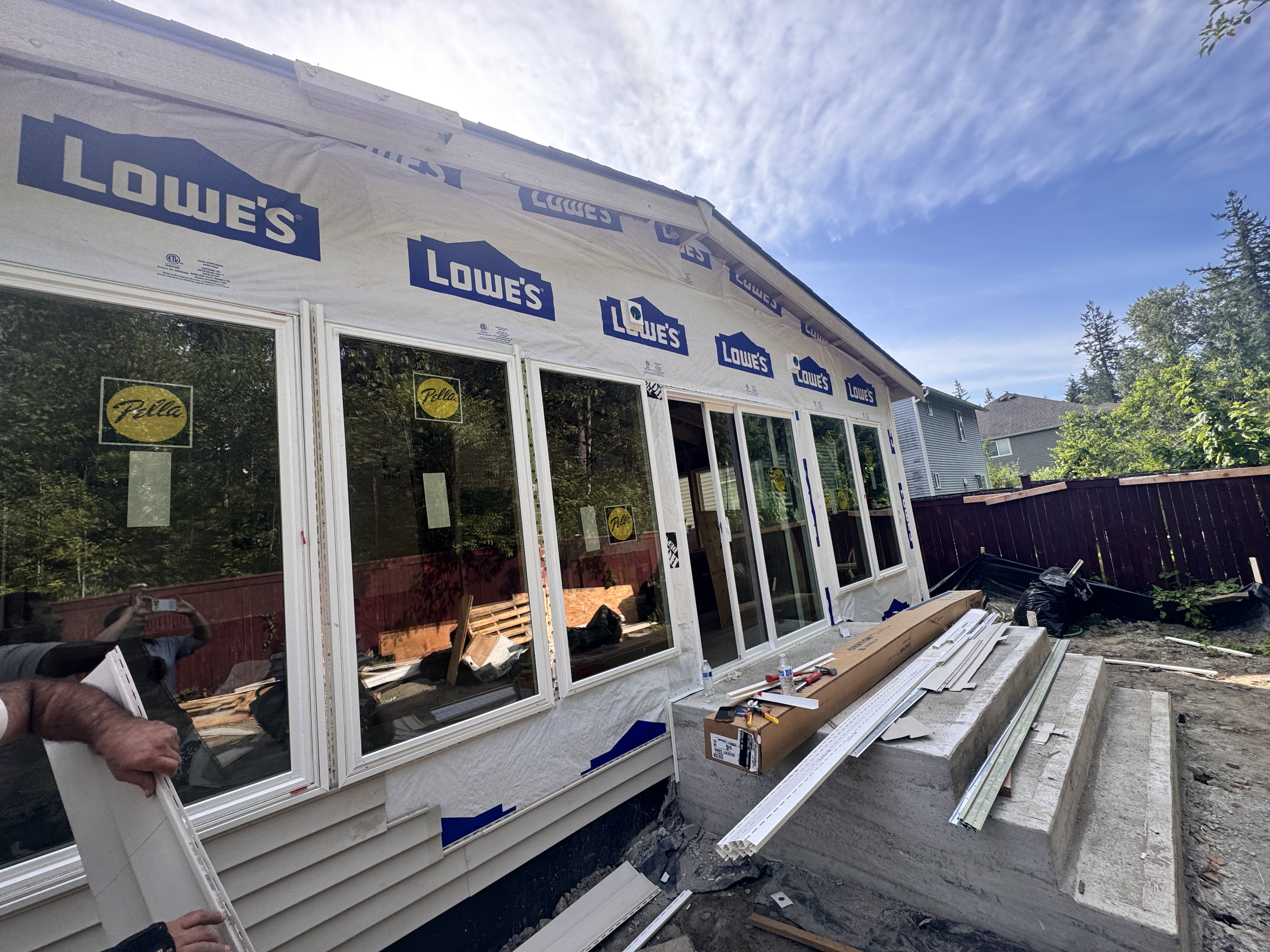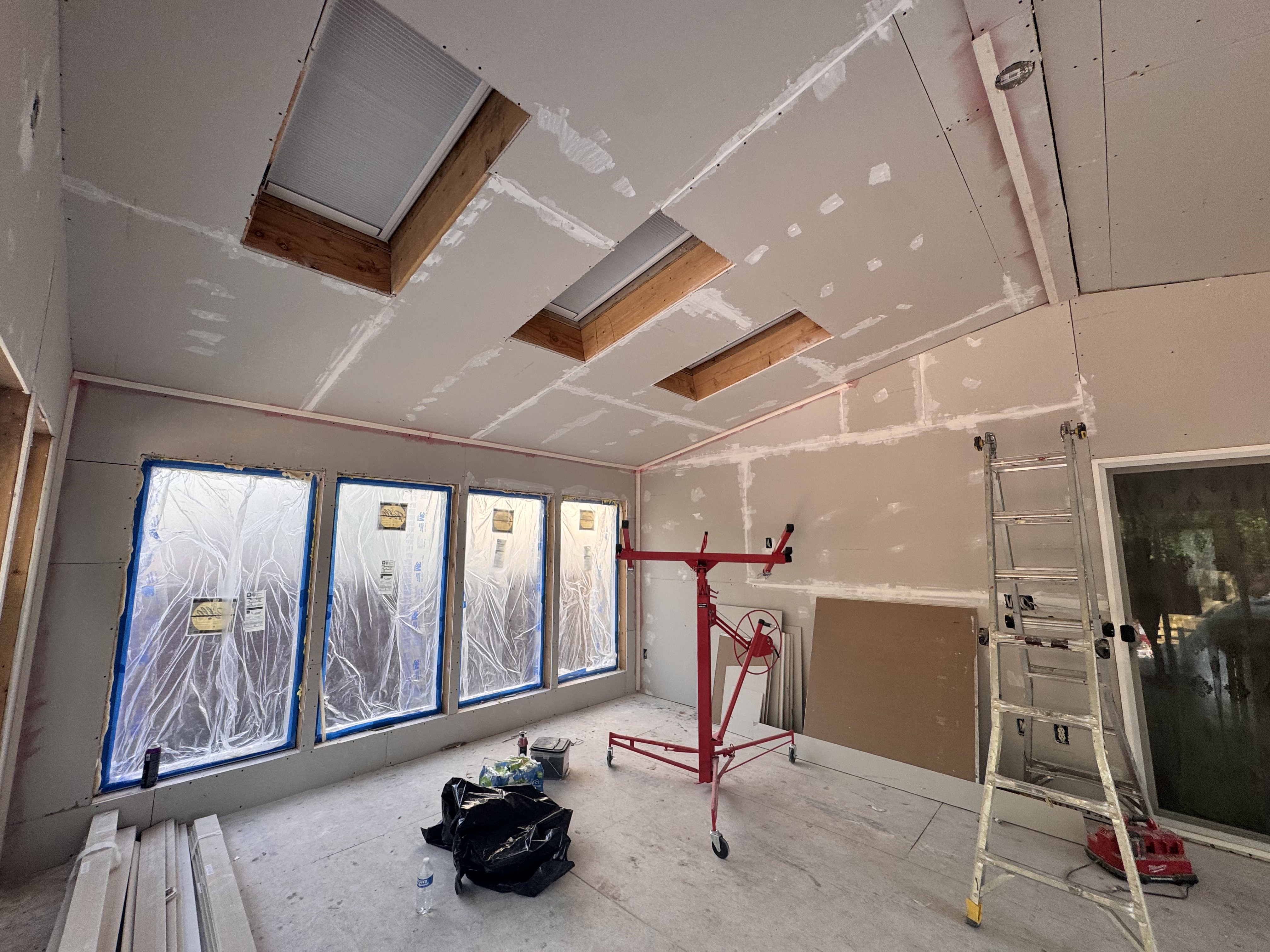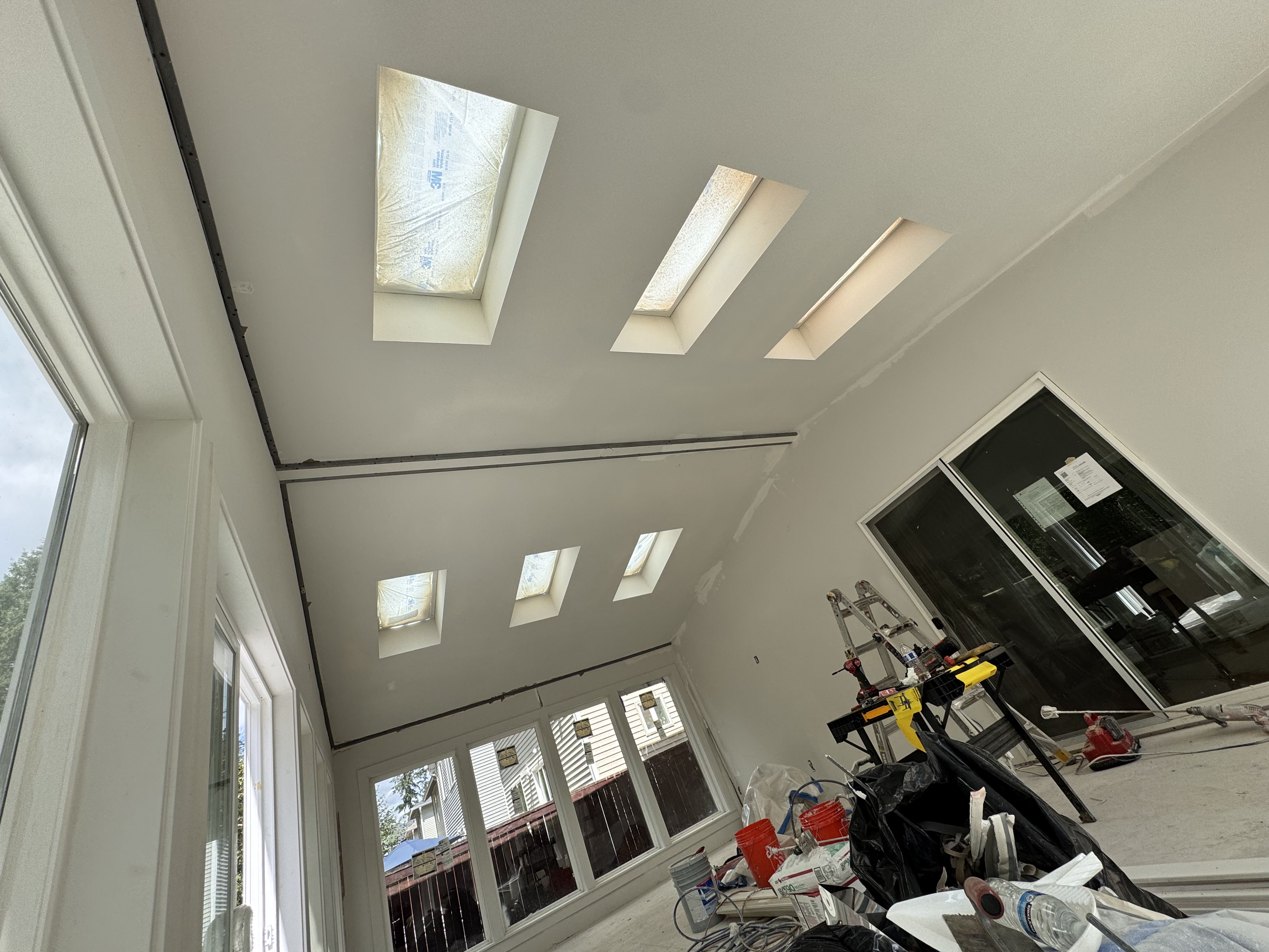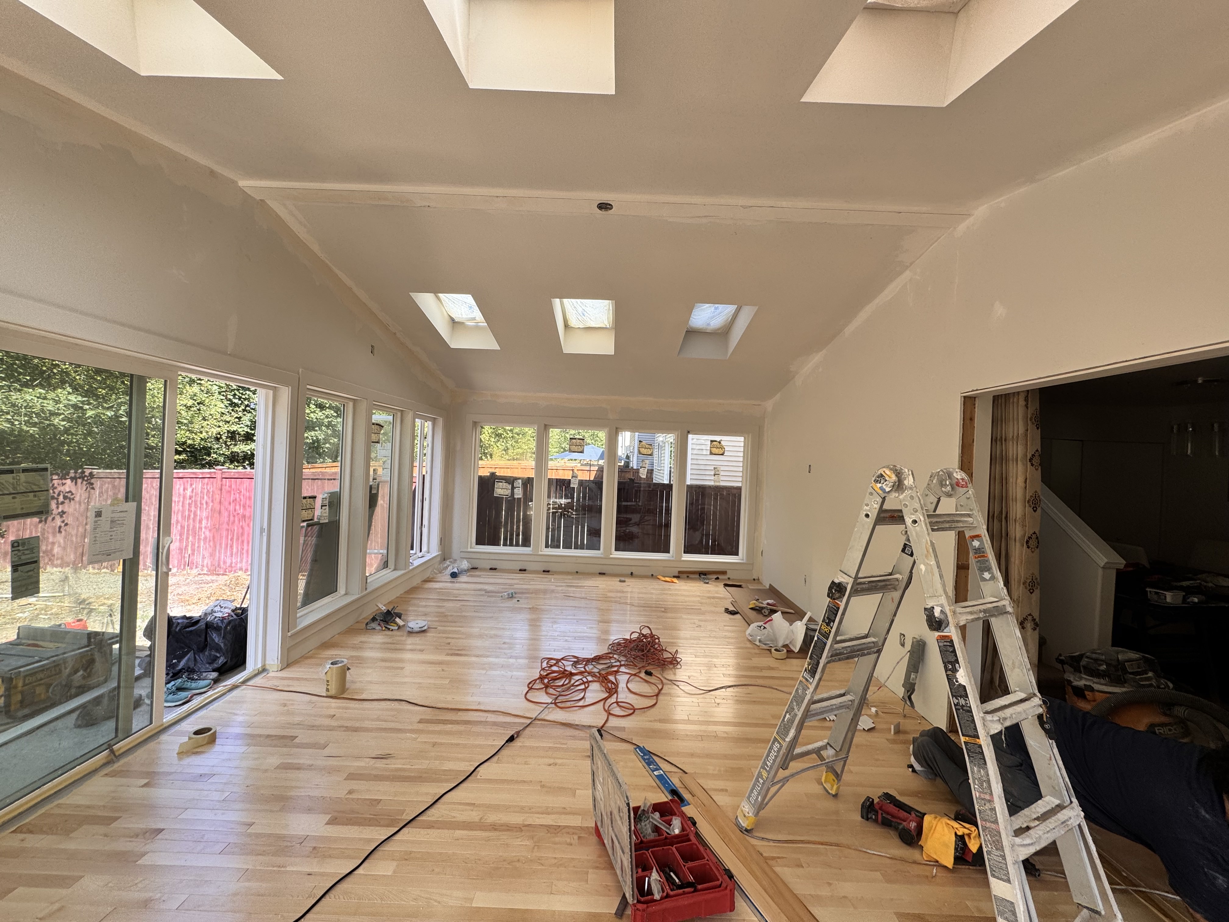 Construction of a Sunroom, starting with designing, permitting process, foundation, framing, roofing, siding, windows, skylights, insulation, finishing, paint.